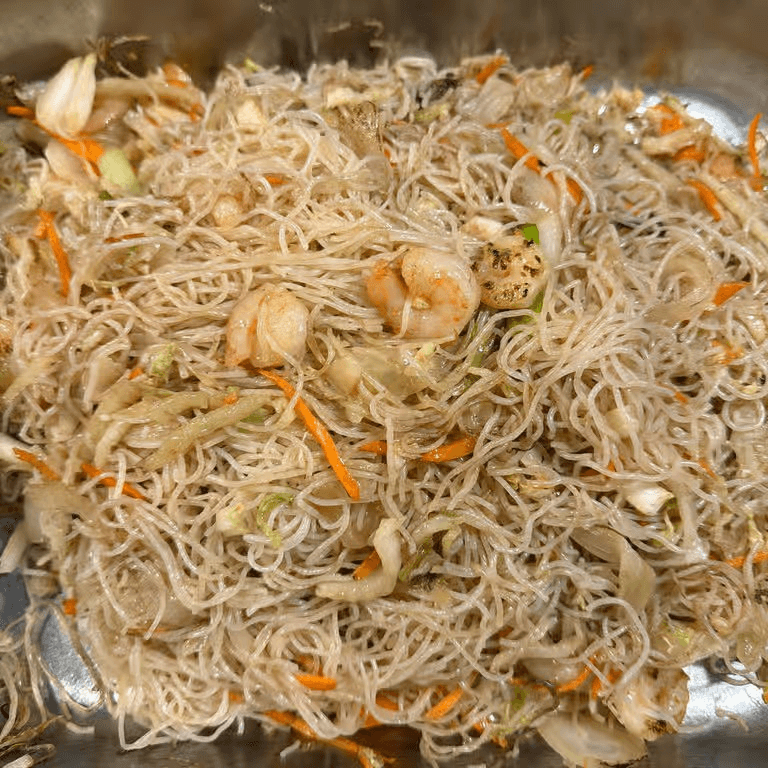 Rice noodles with chicken, beef, and shrimp.