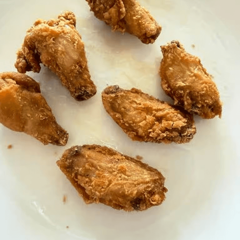 6 Golden fried chicken wings, crispy outside and juicy inside.