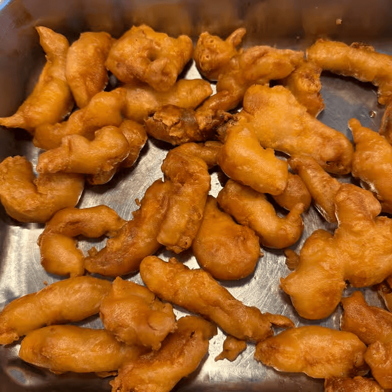 8, Crispy battered scallops with a tender center.
